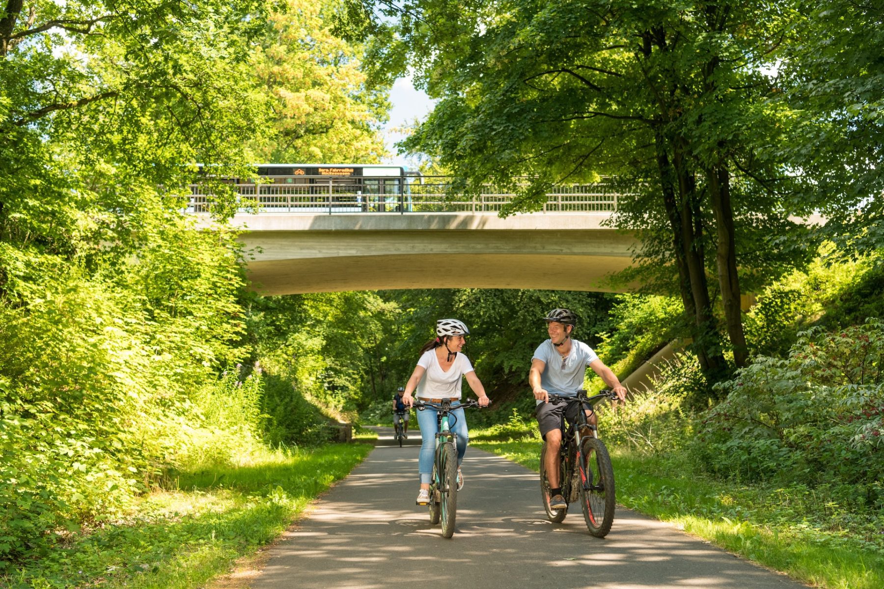 Ondanks dat het Bergische Land een heuvelachtige regio is, hoef je geen doorgewinterde klimmer te zijn om met je tweewieler het land te doorkruisen. De oude spoorlijnen, die vandaag de dag tot panorama-fietsroutes zijn omgedoopt, zorgen ervoor dat je moeiteloos door het glooiende landschap kunt rijden. Zo wordt fietsen in het Bergische Land leuk en relaxt. Over bruggen, door tunnels en langs voormalige stations wordt de natuur ook met de nodige historie gecombineerd.