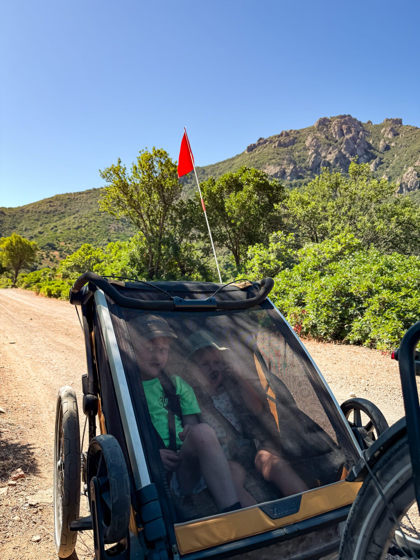 De zit is zeer comfortabel en ook goed voor langere ritten. De kids moeten overigens niet al te groot zijn, want dan wordt het op een gegeven moment toch té knus en dus ongezellig. Extra fijn: genoeg optionele ventilatie en bescherming tegen wind en regen. Dit is geen simpele kar, maar een doordachte modulaire bike-a-van. In Zuid-Europa hebben we zelf geen regencover hoeven gebruiken, maar juist extra ventilatie open zetten. Ook de zonnewering is top om erbij te hebben.