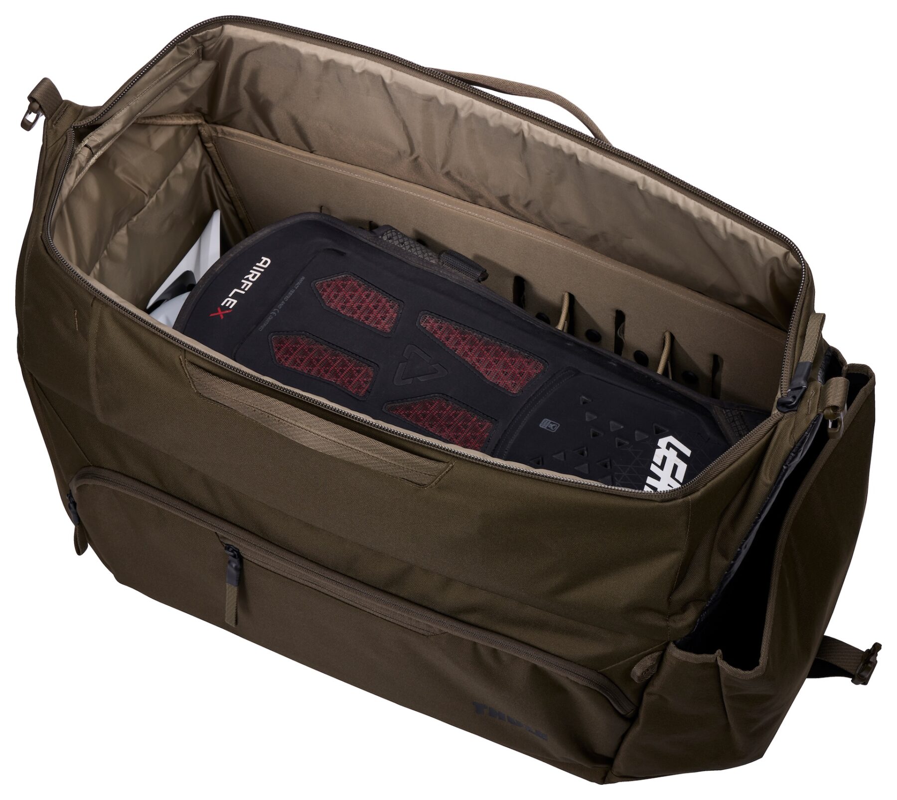 De binnenkant is volledig naar eigen wens in te delen met uitneembare verdelers. Zo kun je helmen, kleding en pads gescheiden houden, terwijl speciale gevoerde vakken je goggles en fietsbrillen beschermen tegen krassen. Het is daardoor ook meteen een ideale duffel voor als je veel wintersportgear mee wil nemen op wintersport. Twee vliegen in één klap.